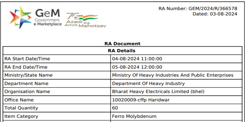 India: BHEL books 60 t of ferro molybdenum at reverse auction