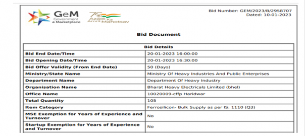 Bharat Heavy Electricals Limited (BHEL), the corporate entity of Vizag Steel, has invited bids for procurement of 105 t (40-150 mm) of HC ferro silicon (70% min) for three months from purchase order date. The last date for bid submission is 20 Jan’23. SteelMint’s assessment for ferro silicon prices stood at around INR 1,18,000/t exw-Guwahati on 6 Jan’23.