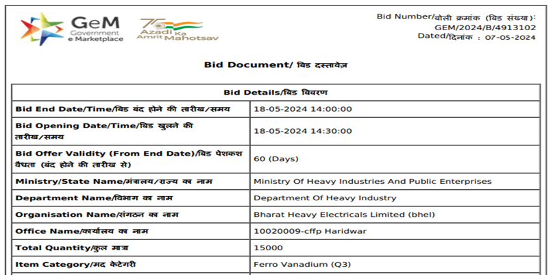 Bharat Heavy Electricals Limited (BHEL) has invited bids for procurement of 15 t (V: 50-55%, size: 10-50 mm) of ferro vanadium for its Haridwar-based unit. The last date for submission of bids is 18 May’24 and the bid offer is valid for 60 days. The material will be delivered within 90 days from the date of purchase order.