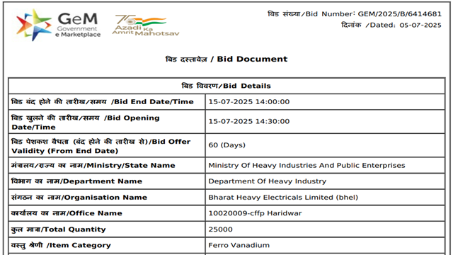 Bharat Heavy Electricals Limited (BHEL) has invited bids for the procurement of 25 t of ferro vanadium (V: 50-55%, size: 10-50 mm) for its Haridwar-based unit. The last date for submission of bids is 15 Jul’25, and the bid offer is valid for 60 days. The material is to be delivered within 90 days from the date of the purchase order.
