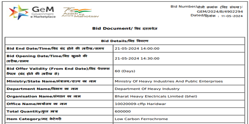 Bharat Heavy Electricals Limited (BHEL) has issued a purchase tender for 600 t of low-carbon (LC) ferro chrome (Cr: 65-75%, C: 0.10% max, 10-50 mm) for its Haridwar-based unit. The last date for submission of bids is 21 May’24 and the bid offer is valid for 60 days from the last date. Delivery of the material is scheduled within 90 days from the date of purchase order.