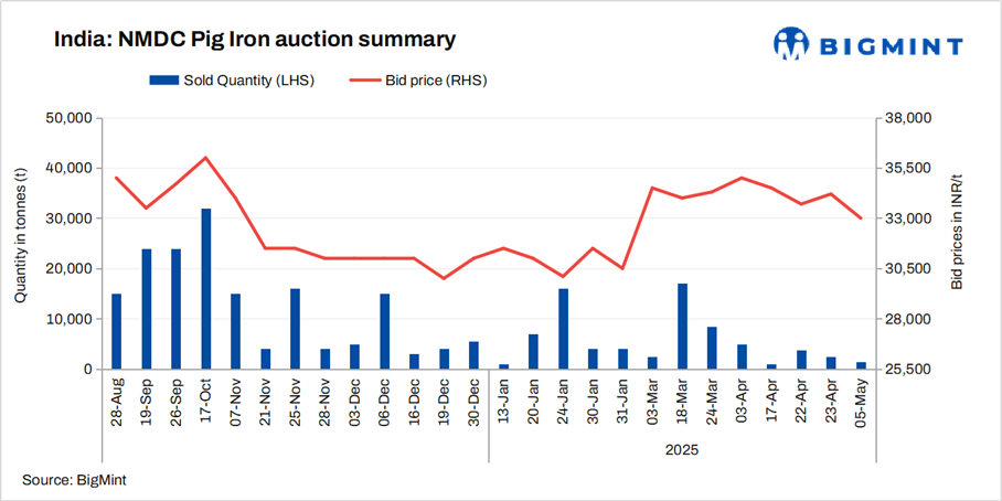 NMDC’s steel plant in Nagarnar, Chhattisgarh, conducted an auction for 10,000 t of steel-grade pig iron (for road transport) on 5 May’25. Of the total offered quantity, 1,500 t were booked at the base price of INR 33,000/t. This is INR 1,200/t lower than the bid prices at the previous auction on 23 Apr’25, where, out of the 15,000 t on offer, 2,500 t were booked at the base price of INR 34,200/t (for road transport).