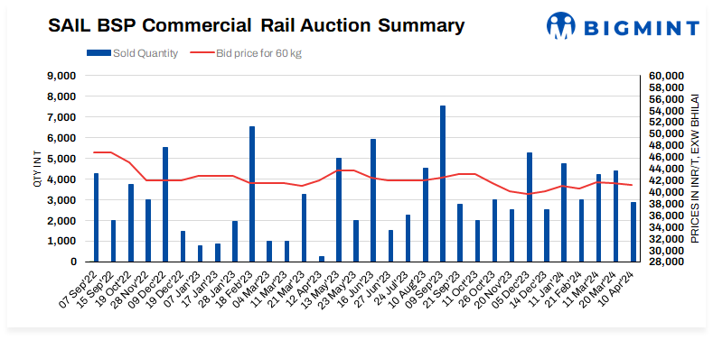 SAIL conducted an auction for 3,200 t (60 kg and 52 kg, full length) of commercial rails on 10 Apr’24 from Bhilai Steel Plant (BSP). Around 2,750 t of 60-kg rail out of 3,000 t was booked at an average price of INR 41,200/t exw. Bids fell by INR 300/t from 20 March auction. 100 t of 52-kg rail out of 200 t was booked at INR 71,000/t exw.