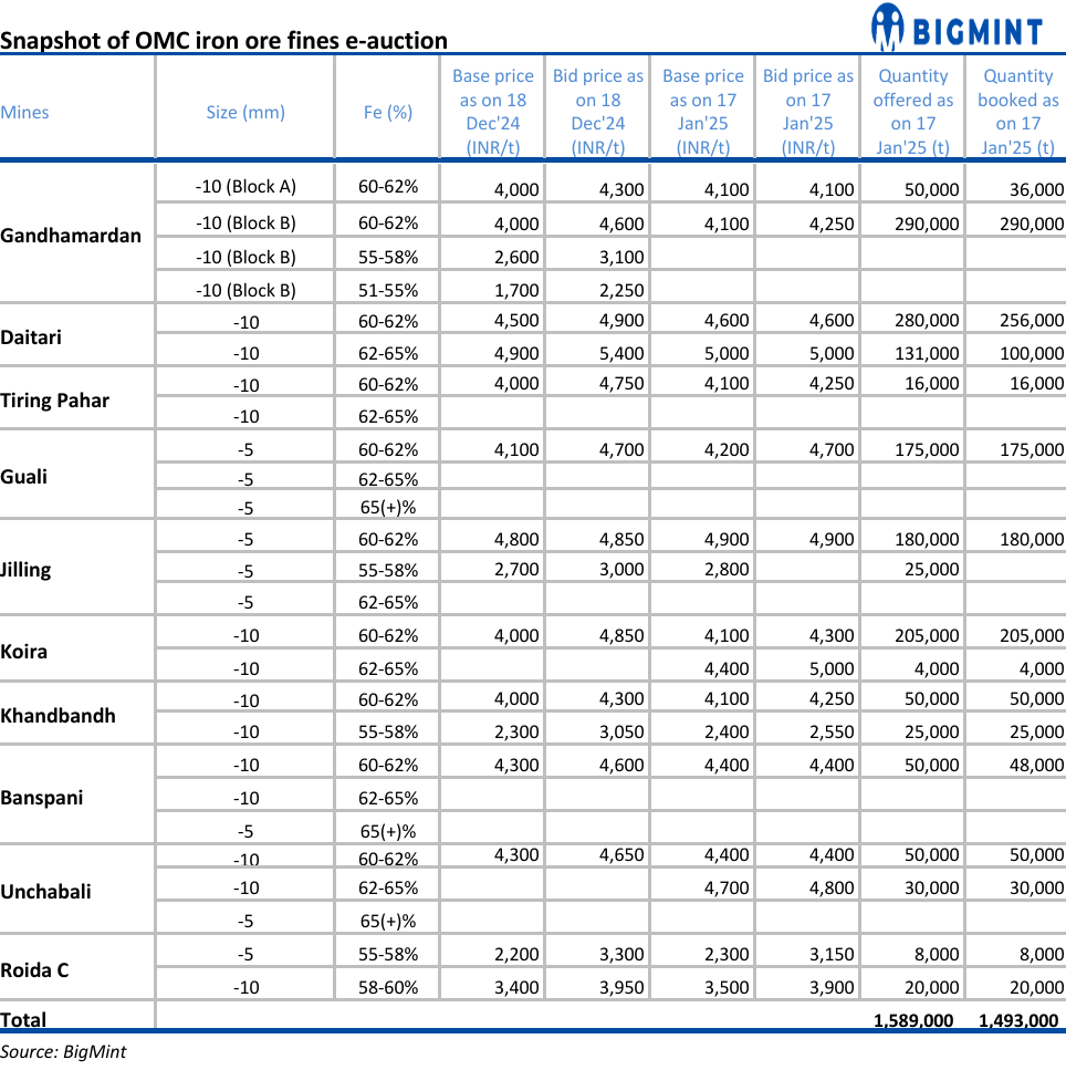 In OMC’s auction for around 1.589 mnt of iron ore fines (Fe 55-65%) on 17 Jan’25, around 1.493 mnt (94%) quantity was booked at INR 2,550-5,000/t ex-mines. The bids fetched premium of INR 150-850/t for a few lots against the set base price. However, weighted average bids fell by around INR 250/t m-o-m. The miner increased the base prices by around INR 100/t m-o-m for fines.