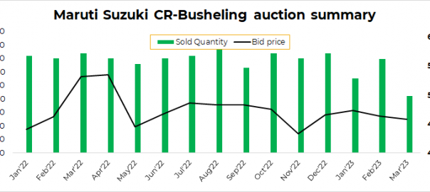 India’s largest four-wheeler manufacturer, Maruti Suzuki India Limited, held an auction for 2,600 t of CR busheling prompt scrap (low manganese) from its Gurgaon facility on 28 Mar’23. The entire quantity was booked at INR 45,880/t ex-works. Bid prices have come down by INR 470/t against the last auction on 24 Feb’23 at which 4,000 t of material received bids at INR 46,350/t exw.