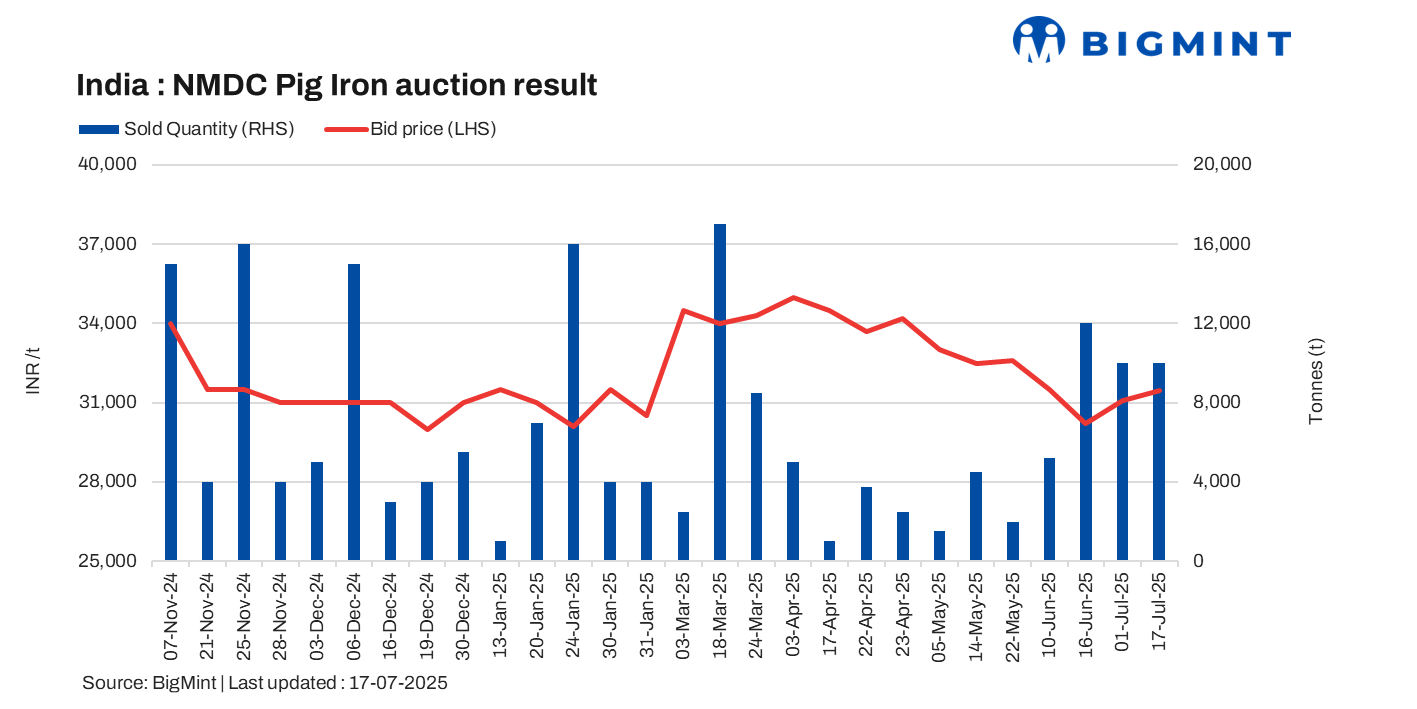 NMDC’s steel plant in Nagarnar, Chhattisgarh, auctioned 10,000 t of steel-grade pig iron on 17 Jul’25, with the entire quantity getting booked at an average price of INR 31,450/t (by road). However, management approval is still pending. Bids increased by INR 350/t from the previous auction on 1 Jul’25 for 10,000 t where the entire quantity were booked at an average of INR 31,100/t (by road).