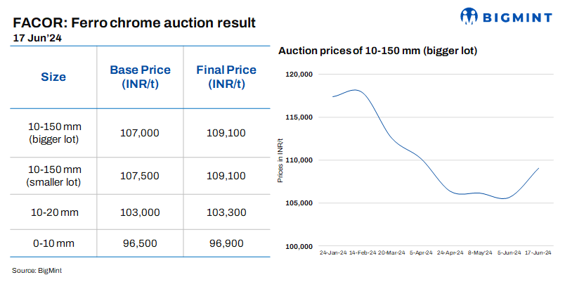 At the Vedanta-FACOR ferro chrome auction on 17 Jun’24, the larger lot of 10-150 mm achieved an H1 price of INR 109,100/t, a 3% increase from the 5 June auction. Smaller lots were also sold at the same price. Rising offers amid tight supply of the material could be attributed to the rise in bid prices. Official confirmation regarding results is awaited.