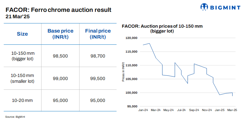 At Vedanta-FACOR’s ferro chrome auction today, the larger lot of 10-150 mm fetched an H1 price of INR 98,700/t exw, slightly above the base price of INR 98,500/t exw. Bids dropped by INR 1,300/t from the 7 Mar’25 auction, likely due to weak demand and cautious market sentiment following yesterday’s chrome ore auction by OMC.