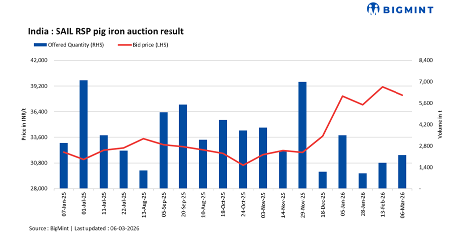 SAIL’s Rourkela Steel Plant (RSP) auctioned 2,200 t of steel-grade pig iron on 06 Mar’26, with the entire quantity sold at an average INR 38,200/t exw. Prices declined by INR 900/t compared with the 13 Feb’26 auction, where 1,700 t were booked at an average INR 39,100/t exw.
