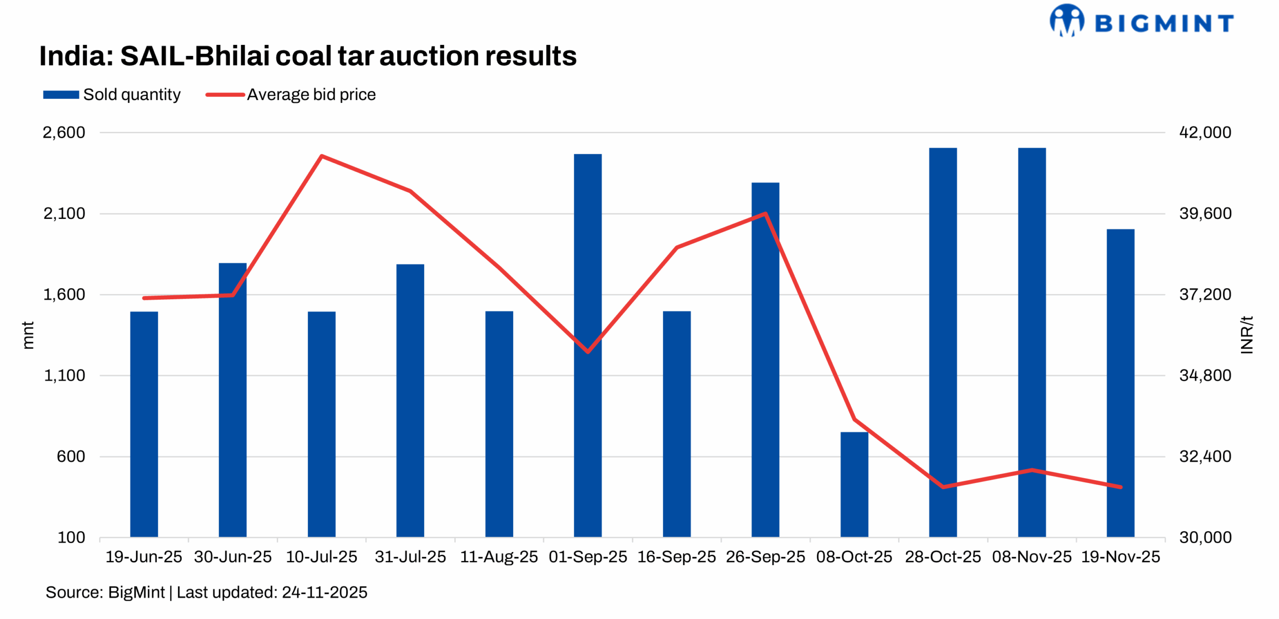 SAIL’s Bhilai Steel Plant sold 2,004 t of crude coal tar in its auction on 19 Nov’25 at a weighted average price of INR 31,500/t ex-works, reflecting a decline of INR 500/t from the 8 Nov auction. The price correction aligns with softer market sentiment compared to the earlier auction, where 2,506 t were awarded at INR 32,000/t.