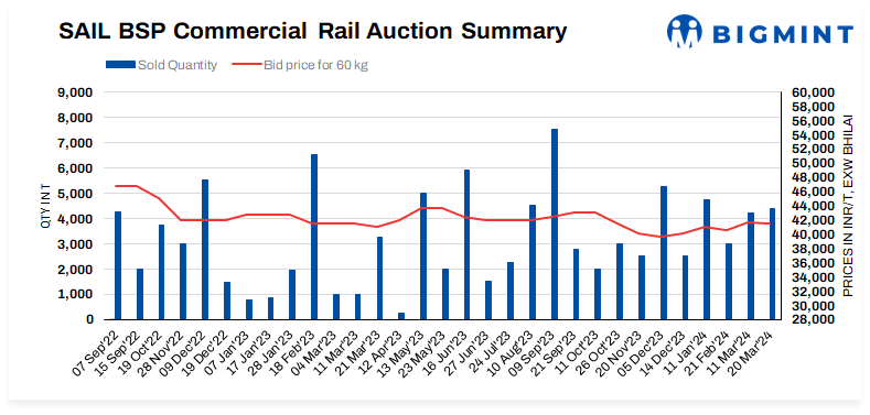 Steel Authority of India Limited (SAIL), conducted an auction for 4,400 t (60 kg and 52 kg, full length) of commercial rails on 20 Mar’24 from Bhilai Steel Plant (BSP) in Chhattisgarh. Buyers booked around 4,000 t of 60 kg rail at an average price of INR 41,500/t exw, bids fell by INR 200/t from previous auction held on 11 March. While 400 t of 52 kg rail booked at INR 70,500/t exw.