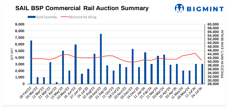 Steel Authority of India Limited (SAIL), conducted an auction for 3,300 t (60 kg and 52 kg, full length) of commercial rails on 24 Jul’24 from Bhilai Steel Plant (BSP) in Chhattisgarh. Buyers booked around 3,000 t of 60 kg rail at an average price of INR 40,800/t (INR 40,600-42,200/t) exw, bids fell by INR 3,620/t from previous auction held on 11 July. Meanwhile, 100 t of 52 kg rails out of 300 t were booked at INR 70,500/t exw.