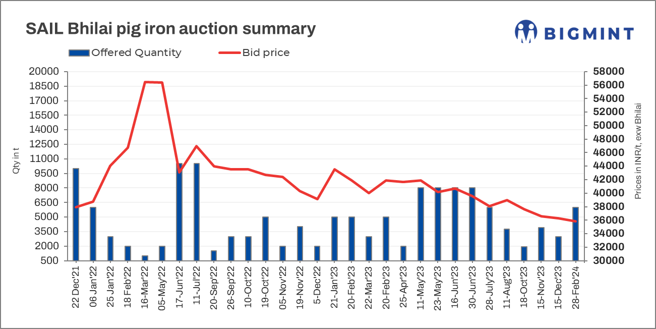 SAIL-Bhilai Steel Plant (BSP) held an auction for 5,980 t of steel-grade pig iron on 28 Feb’24. According to sources, entire quantity was booked at an average price of INR 35,800-36,100/t exw.