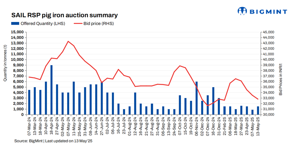 SAIL’s Rourkela Steel Plant (RSP) auctioned 6,000 t of steel-grade pig iron on 13 May, with 1,500 t booked at a base price of INR 32,800/t exw. This marks an INR 700/t drop from the previous auction on 6 May, where 900 t were booked at INR 33,500/t exw.