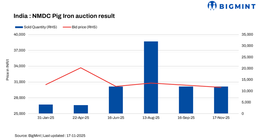 NMDC’s steel plant in Nagarnar, Chhattisgarh, conducted a steel-grade pig iron auction for 12,000 t on 17 Nov’25, of which the entire quantity were booked at an average price of INR 30,000/t (by rake). However, management approval is still pending. In the previous approved auction, held on 16 Sept’25 for 32,000 t, 12,000 t quantity was booked at an average price of INR 30,400/t (by rake).