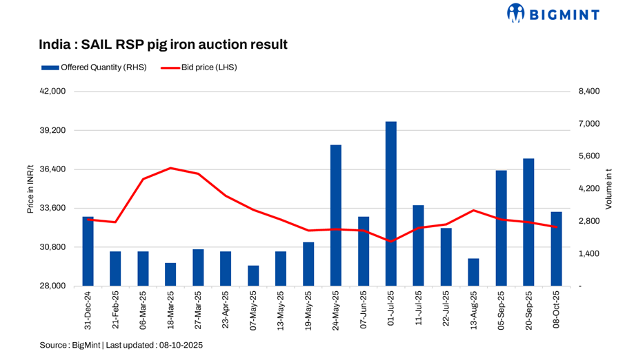 SAIL’s Rourkela Steel Plant (RSP) conducted an auction on 8 Oct’25 for 3,200 t of steel-grade pig iron, in which the entire quantity was booked at an average price of INR 32,350/t exw. This marked a decrease of INR 250/t compared to the previous auction on 20 Sep, in which a total quantity of 5,500 t was sold at INR 32,600/t exw.