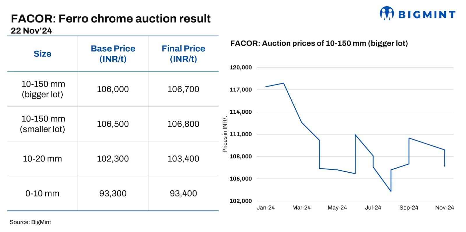 At Vedanta-FACOR’s ferro chrome auction yesterday, the larger lot of 10-150 mm achieved an H1 price of INR 106,700/t exw, slightly above the base price of INR 106,000/t exw. Compared to the 11 Nov’24 auction, bids dropped drastically by INR 2,200/t, likely due to subdued ferro chrome demand.