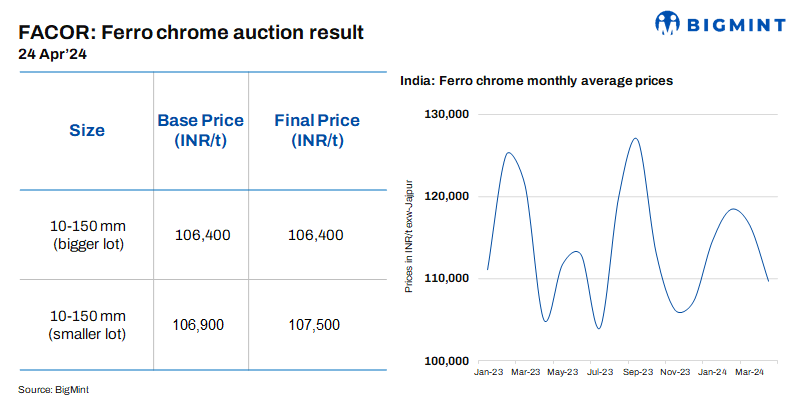 At Vedanta-FACOR’s ferro chrome auction today, the bigger lot (10-150 mm) secured an H1 price of INR 106,400/t exw, matching the base price. The smaller lot of same size fetched INR 107,500/t exw. Bids were on ex-plant basis with 60% Cr pro rata, excluding GST. The INR 3,800/t m-o-m decline in bids reflects subdued conditions in the domestic stainless steel market.