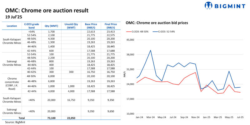 At OMC’s chrome ore auction today, 51,050 t was sold out of 73,100 t offered. Bids showed mixed trends m-o-m, dropping by 0.1–2% (INR 10-465) for the majority of grades and rising by 1–3% (INR 213-290/t) for some. As compared to base prices, final bids fetched premiums up to 4%. The auction showcased the trend of limited movement in ferro chrome prices in the domestic market.