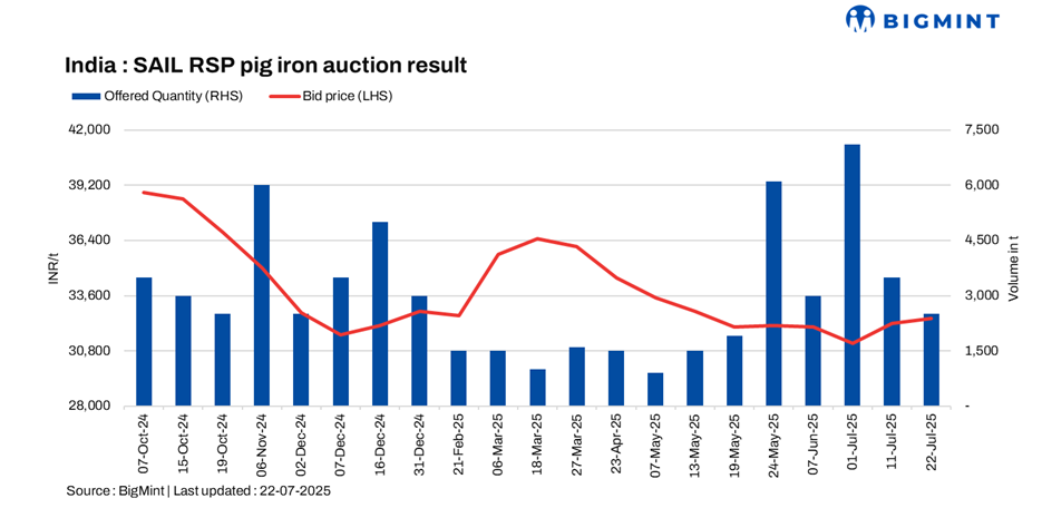 SAIL’s Rourkela Steel Plant (RSP) conducted an auction on 22 Jul’25 for 2,500 t of steel-grade pig iron in which the entire quantity was booked at an average price of INR 32,450/t exw – an increase of INR 250/t compared to the previous auction on 11 Jul in which the total quantity of 3,500 t was sold at INR 32,200/t exw.