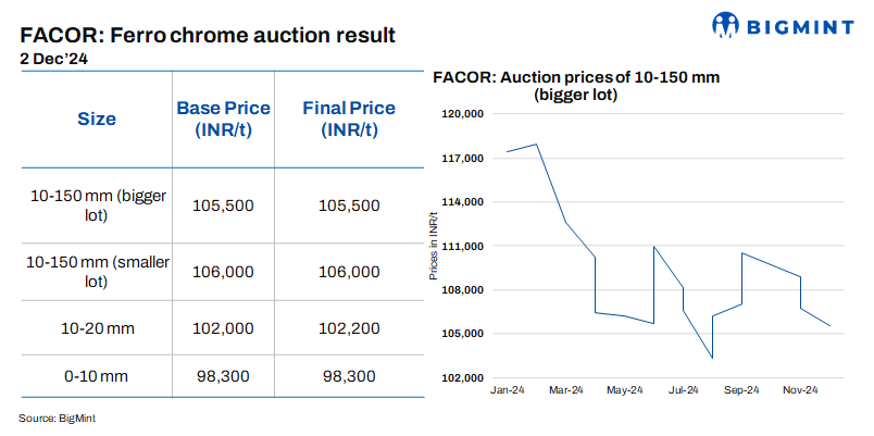 At Vedanta-FACOR’s ferro chrome auction today, the larger lot of 10-150 mm fetched an H1 price of INR 105,500/t exw, same as the base price. This reflects a drop of INR 1,200/t from the previous 22 Nov’24 auction. The decline in bids is likely due to subdued demand and buyers’ continued resistance to higher offers.