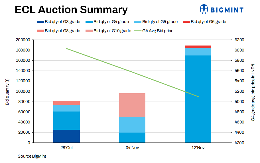Bid prices fall: G4 emerged as the star of the 12 November auction, fetching an average price of INR 5,098/t. However, bids corrected by INR 474/t against the 4 November auction, where the average bid price of the grade was INR 5,572/t.