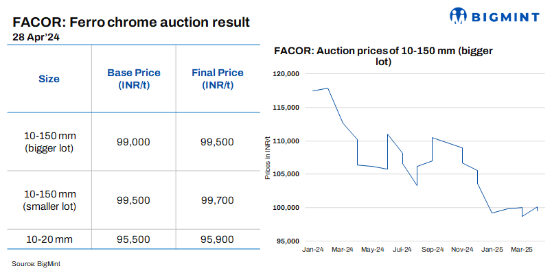 At Vedanta-FACOR’s ferro chrome auction yesterday, the larger lot of 10-150 mm fetched an H1 price of INR 99,500/t exw against the base price of INR 99,000/t exw. Bids fell slightly by INR 600/t in comparison to the previous auction on 14 Apr’25. The fall in bids is likely due to lower buying interest in the market and prevailing bid-offer gaps.