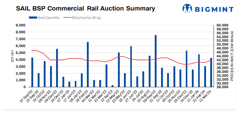 Steel major, Steel Authority of India Limited (SAIL), conducted an auction for 4,200 t (60 kg and 52 kg, full length) of commercial rails on 11 Mar’24 from Bhilai Steel Plant (BSP) in Chhattisgarh. Buyers booked around 4,000 t of 60 kg rail at an average price of INR 41,700/t exw, while 200 t of 52 kg rail booked at INR 70,500/t exw.
