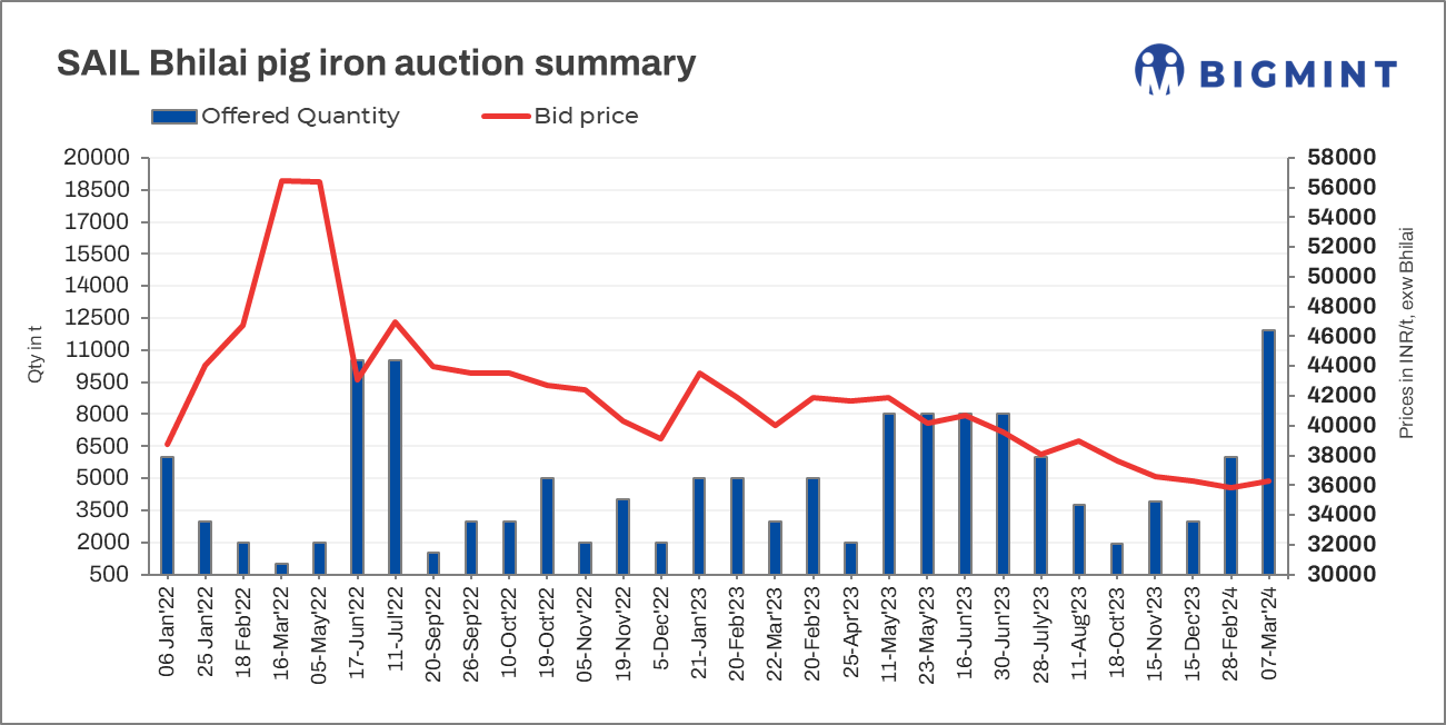 SAIL-Bhilai Steel Plant (BSP) held an auction for 11,950 t of steel-grade pig iron on 7 March’24. According to sources, the entire quantity was booked at an average price of INR 36,300/t exw.