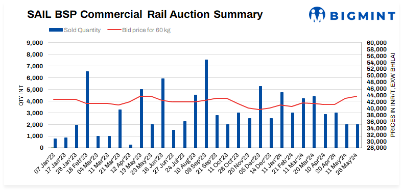 SAIL conducted an auction for 2,500 t (60 kg and 52 kg, full length) of commercial rails on 26 May’24 from Bhilai Steel Plant (BSP) in Chhattisgarh. Buyers booked around 2,000 t of 60 kg rails at an average price of INR 43,700/t (INR 42,250-45,100/t) exw, bids increased by around INR 600/t from previous auction conducted on 11 May. Meanwhile, 500 t of 52 kg rails remained unsold.