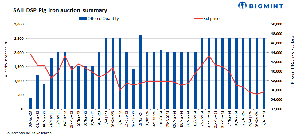SAIL-Durgapur Steel Plant (DSP) held an auction for 2,500 t of steel-grade pig iron on 7 Nov’24. The entire quantity received bids at an average price of INR 35,600/t exw.
