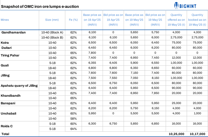 In OMC’s auction for 1.025 mnt of iron ore lumps (Fe 58-65%) on 19 May’25, 1.017 mnt (99%) were booked at INR 5,500-8,150/t, with premiums of 2-17% over the base prices. Weighted average bids remained stable m-o-m. Pre-monsoon restocking of raw materials led to a positive response from sponge iron makers. Earlier, the miner had reduced base prices by INR 450/t m-o-m amid weaker market sentiments.
