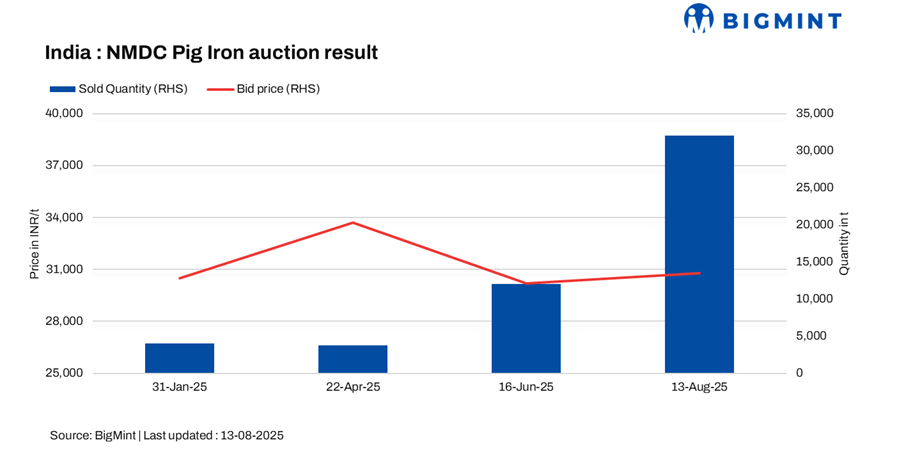 NMDC’s steel plant in Nagarnar, Chhattisgarh, conducted a steel-grade pig iron auction for 32,000 t on 13 Aug’25, of which the entire quantity was booked at an average price of INR 30,800/t (by rake). However, management approval is still pending. In the previous approved auction, held on 16 Jun’25 for 16,000 t, the entire quantity was booked at an average price of INR 30,200/t (by rake).