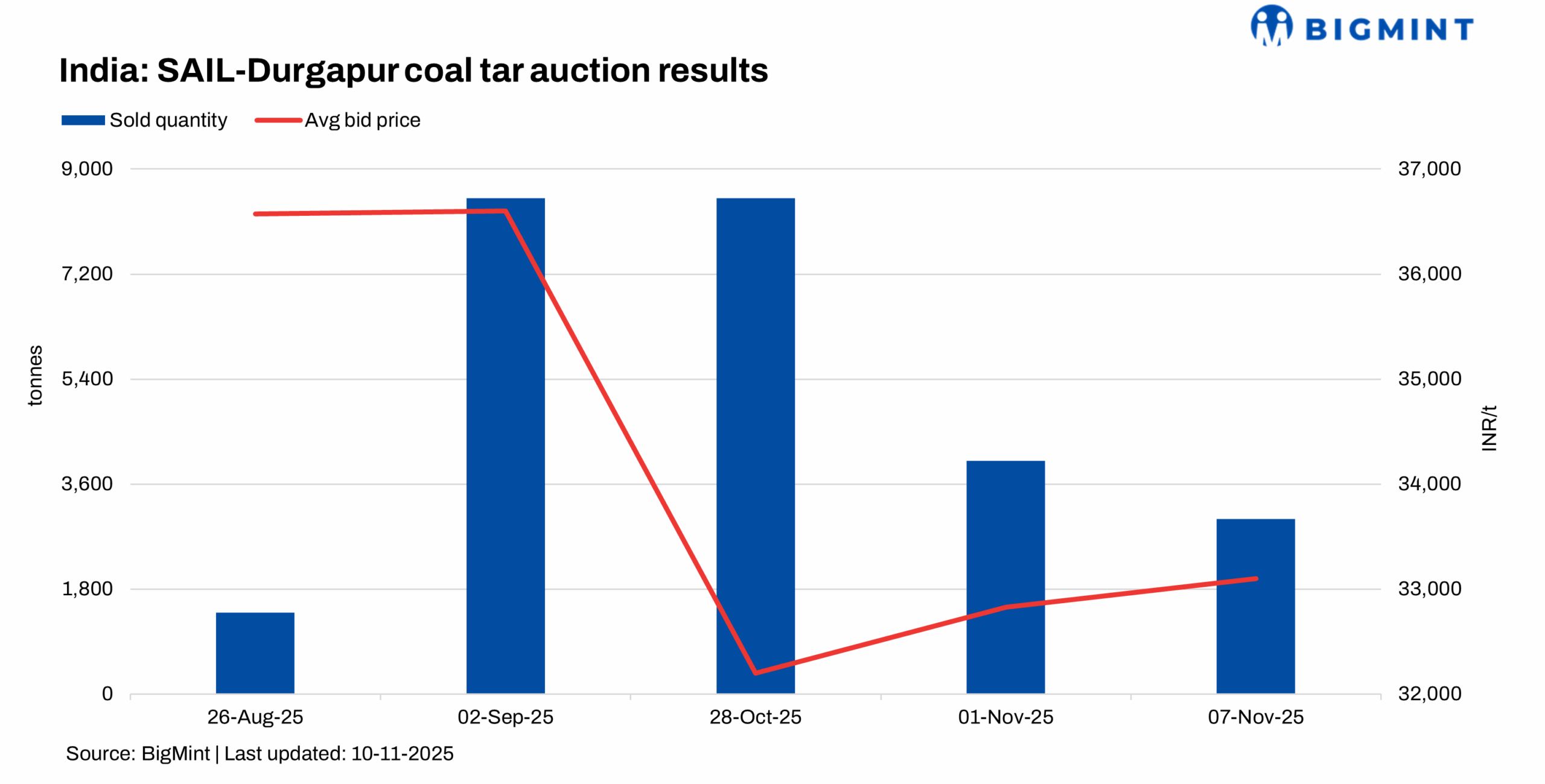 SAIL’s Durgapur Steel Plant sold 3,000 t of crude coal tar in its 7 Nov’25 auction at a weighted average price of INR 33,100/t ex-works. This marks an INR 275/t rise from the previous auction held on 1 Nov’25, in which 4,000 t were sold at a weighted average price of INR 32,850/t.