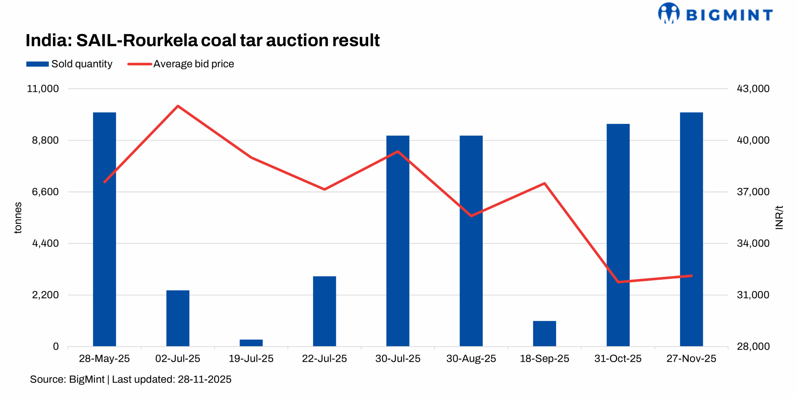 SAIL’s Rourkela Steel Plant sold 10,000 tons (t) of crude coal tar in its 27 Nov auction at a weighted average price of INR 32,115/t ex-works. This marks an INR 360/t rise from the previous auction held on 31 Oct, in which 9,500 t were sold at a weighted average price of INR 31,755/t.