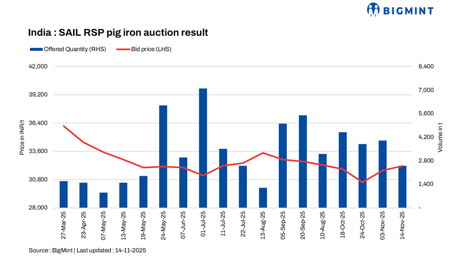 SAIL’s Rourkela Steel Plant (RSP) conducted an auction on 14 Nov’25 for 2,500 t of steel-grade pig iron, in which the entire quantity was booked at an average price of INR 32,150/t exw. This marks an increase of INR 450/t compared to the previous auction on 3 Nov, in which the entire quantity of 4,000 t was sold at INR 31,700/t exw.