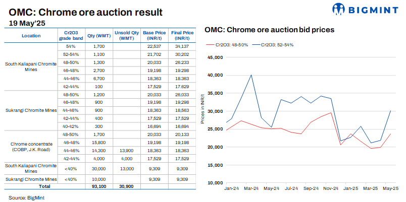 At OMC’s chrome ore auction today, 62,200 t of material was sold out of 93,100 t offered. Bid prices for grades above 48% surged by 3-50% (INR 633-11,324/t) m-o-m, while other grades saw a slight increase of up to 3%. Premiums over the base price reached 51%. Cautious selling by key ferro chrome sellers limited supplies, likely contributing to higher bids.