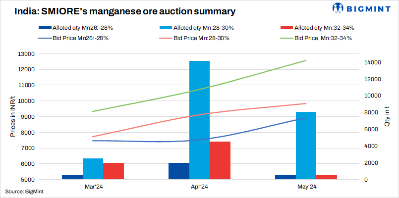 Bids witness rise m-o-m: Analysis showed that auction results for April 2024 bid prices were recorded for manganese ore (Mn: 28-30%) INR 9,421/t ($113/t), while in May 2024 bids were at INR 9,830/t ($99/t), inching up by INR 409/t (4%).