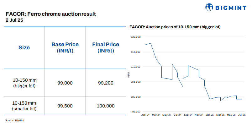 At Vedanta-FACOR’s ferro chrome auction yesterday, the bigger lot of 10-150 mm fetched an H1 price of INR 99,200/t ($1,159/t) exw, slightly above the base price of INR 99,000/t ($1,157/t) exw. Bids were steady as against the previous auction on 23 Jun’25. The stability could be attributed to need-based buying amid weak stainless steel demand.