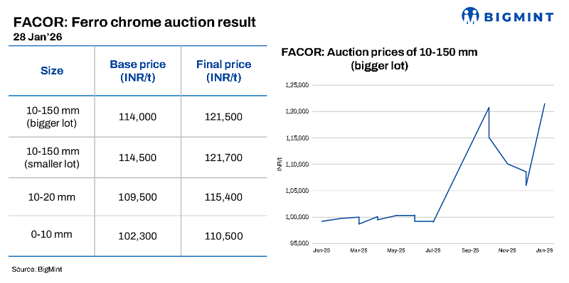 At Vedanta-FACOR’s ferro chrome auction on 28 Jan’26, the larger lot (Cr: 56% min, 10-150 mm) achieved an H1 price of INR 121,500/t ($1,321/t) exw, up INR 7,500/t ($82/t) from base price, while the smaller lot closed at INR 121,700/t ($1,323/t) exw, higher by INR 7,200/t ($78/t) from its base price. The increase was supported by tight supplies and higher bids at OMC’s auction.