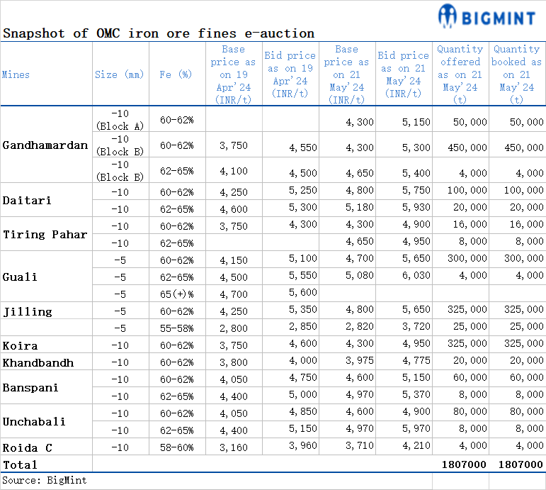 OMC conducted an auction for 1.807 mnt of iron ore fines (Fe 54-65%) on 21 May’24. Entire quantities of fines were booked at INR 4,220-6030/t. Bids for fines have increased by INR 300-1,000/t against the set base price, as per BigMint’s analysis. Active buying amid restocking before upcoming monsoons along with supportive sentiments from pellet, sponge and finished steel market has called for aggressive bids by the steelmakers.