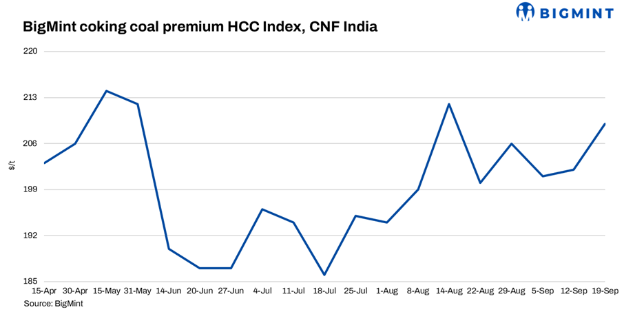 BigMint’s premium hard coking coal (PHCC) index was assessed at $209/tonne (t) CNF Paradip, India, on 20 September 2025, up by $7/t against the previous assessment on 12 September.