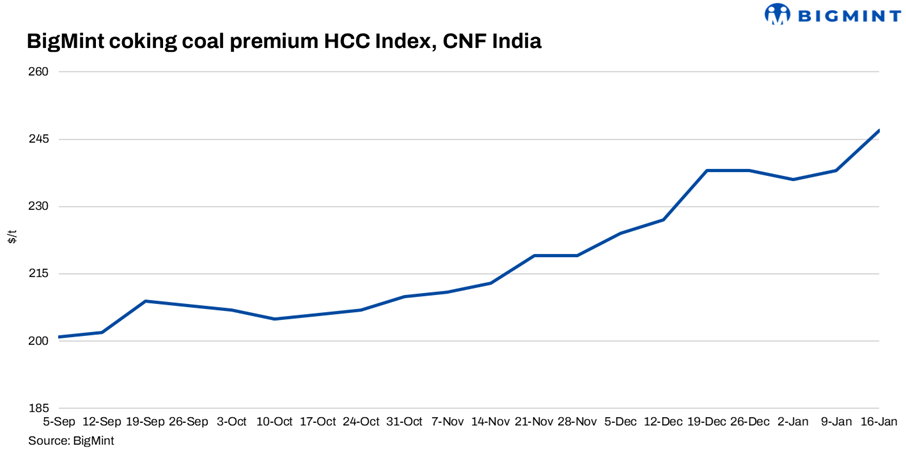 BigMint’s premium hard coking coal (PHCC) index was assessed at $247/tonne (t) CNF Paradip, India, on 16 January 2026, up by $9/t against the previous assessment on 09 January last. However, no firm bookings were so far in this publishing window. Indian steelmakers seem to be considering importing met coke despite the recent imposition of an anti-dumping duty and a steep increase in landed costs. This comes amid a sharp hike in coking coal prices which have risen by $15/t since beginning of Jan’26.