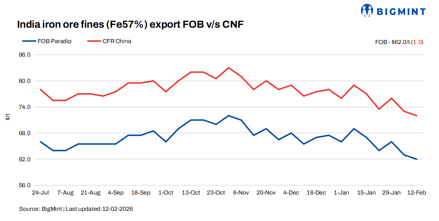 BigMint’s bi-weekly Indian low-grade iron ore fines (Fe 57%) export prices inched down by $1/tonne (t) w-o-w to $62/t FOB east coast on Thursday. Index has hit its lowest since End-Jun’25 with over seven months, as per data maintained with BigMint.