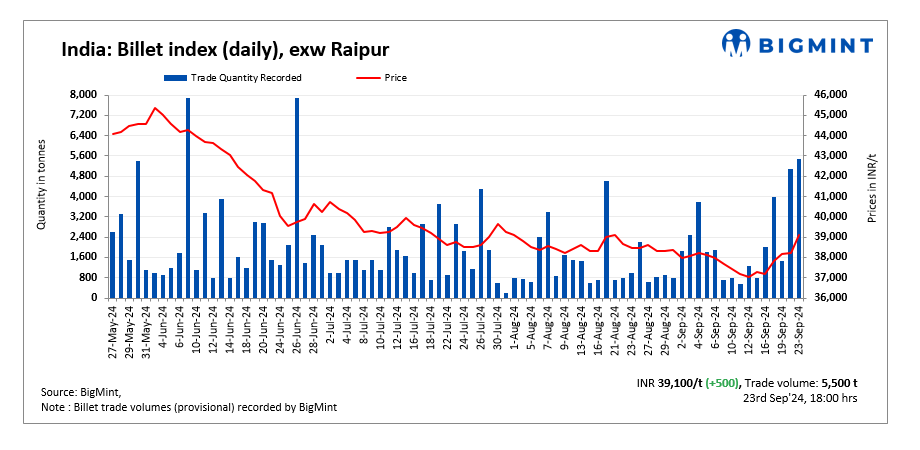 BigMint’s billet index rose INR 500/tonne (t) to INR 39,100/t exw-Raipur on 23 September 2024.