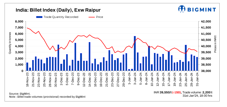 BigMint’s billet index dropped by INR 150/t today, reaching at INR 39,550/t exw-Raipur on 31 January 2024.