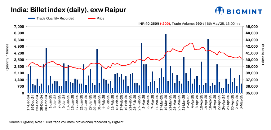 BigMint’s billet index dropped by INR 200/tonne (t) d-o-d, settling at INR 40,250/t exw-Raipur on 6 May 2025, as limited buying activity and ongoing market uncertainty continued to weigh on sentiment.