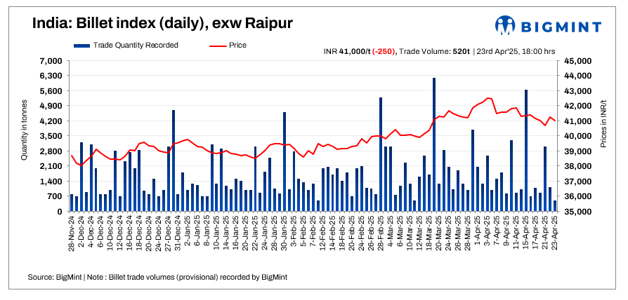 BigMint’s billet index declined by INR 250/tonne (t) d-o-d, settling at INR 41,000/t exw-Raipur on 23 April 2025, amid muted buying interest and weak market sentiments.