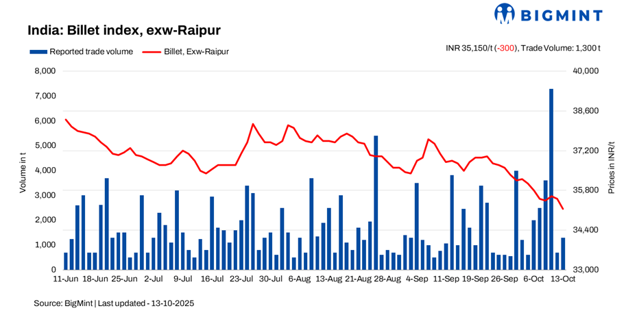 BigMint’s billet index fell by INR 300/tonne (t) d-o-d to INR 35,150/t exw-Raipur on 13 October 2025, as market activity remained sluggish amid continuous weak demand in the semi-finished steel segment.