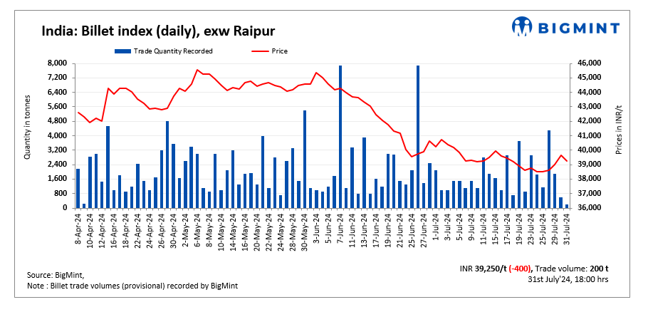 BigMint’s billet index decreased by INR 400/tonne (t) to INR 39,250/t exw-Raipur on 31 July, 2024.
